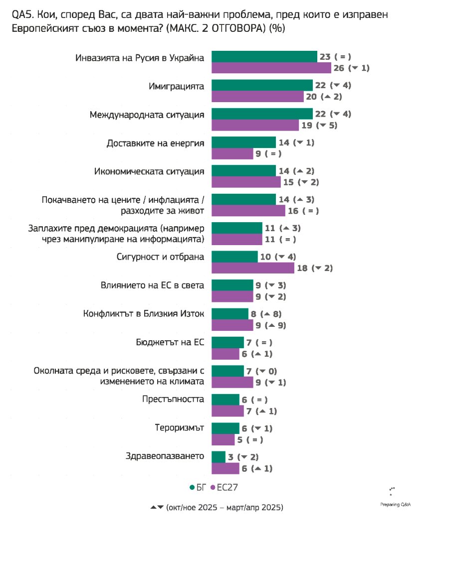 Причината за този негативизъм е ясна – инфлацията. За половината от българите (50%) растящите цени и цената на живота са най-острият проблем пред държавата. Това е значително над средното ниво за ЕС, което е 31%.